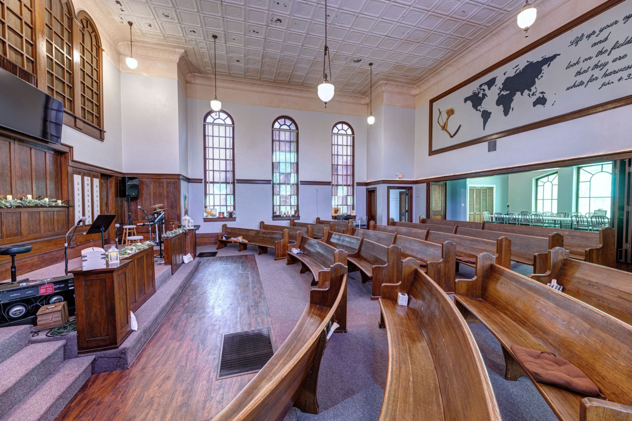 On a lot size of 7,000 square feet, single-family home has large potential, boasting 3,500 square feet of space on the main level alone. It includes five bedrooms and 3.5 bathrooms and three garage spaces, with ample space to fit a range of lifestyles and uses. Other interior features include a breakfast nook, a built-in fireplace and, for enthusiasts of the unusual property type, wooden church pews and stained glass windows.