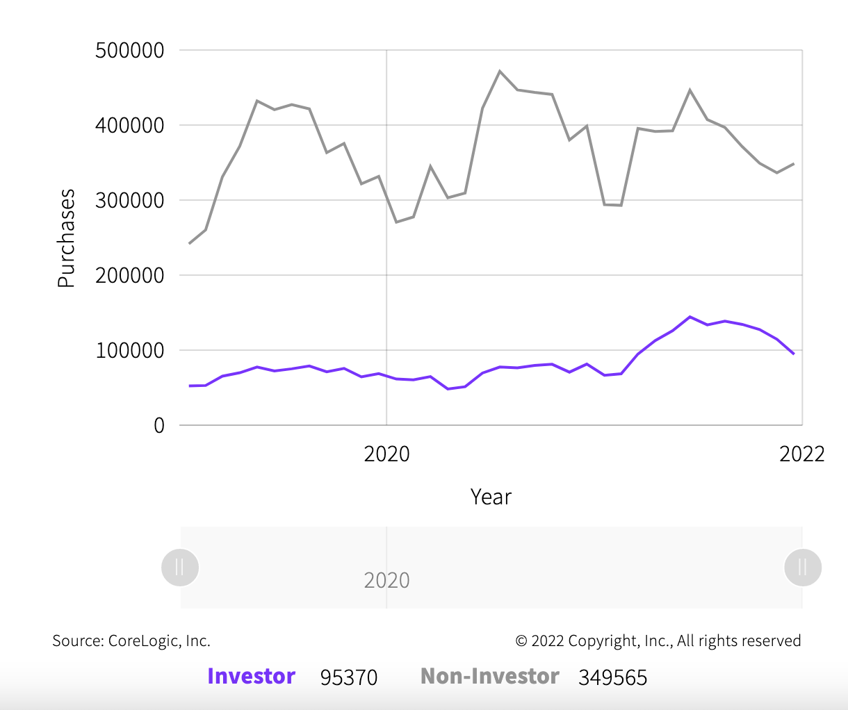 Large investors, who retain 100 or more properties, decreased their activity the most. Of all investor purchases made in December 2021, just 20% were made by large investors — a 6% decrease from September — while small and medium-sized investors actually increased their activity during the period.
