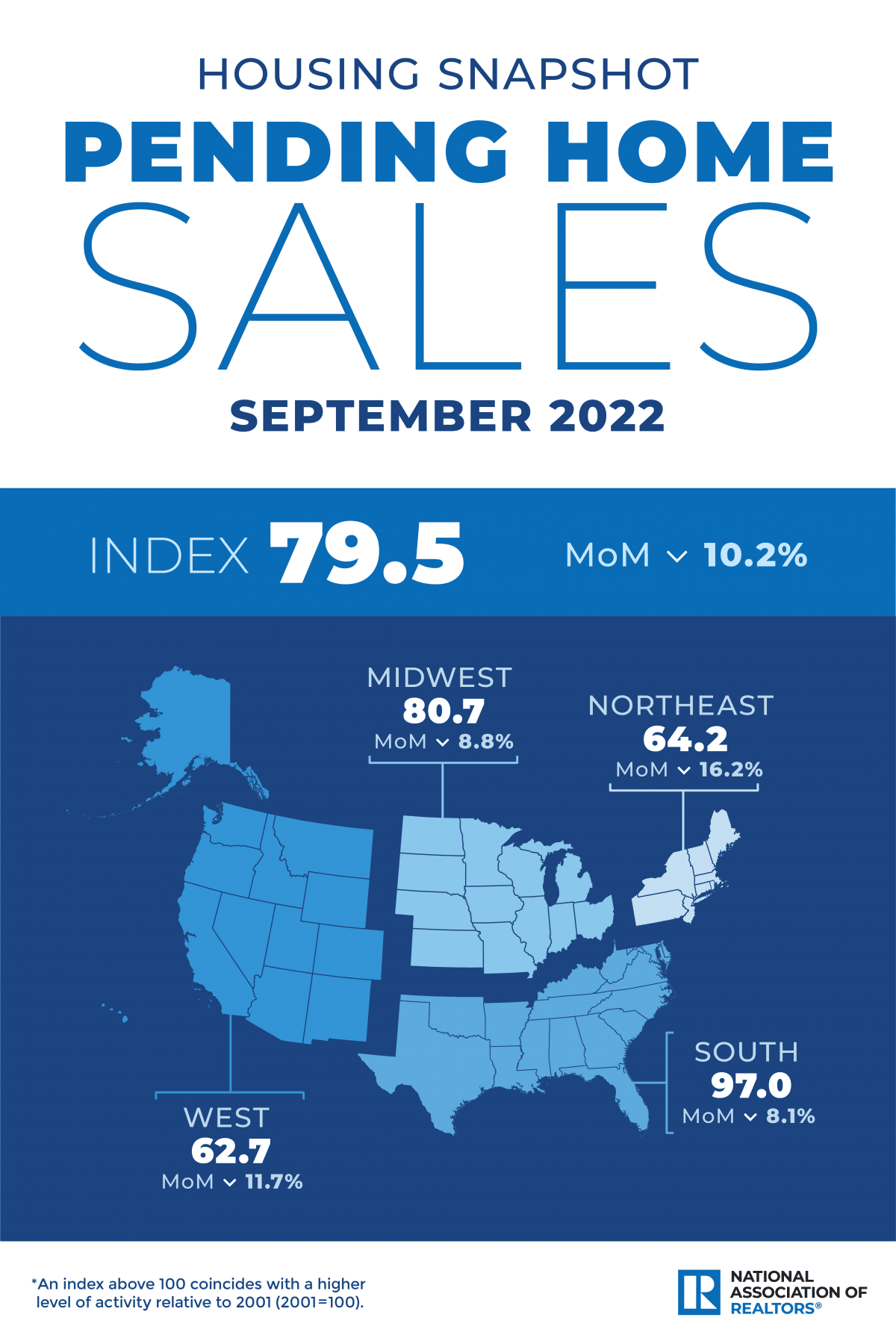 Regionally, all geographic areas saw declines in pending sales, led by the Northeast, which logged a 16.2% decline from August, followed by the West with an 11.7% drop, the Midwest with an 8.8% decrease and the South with an 8.1% slide.