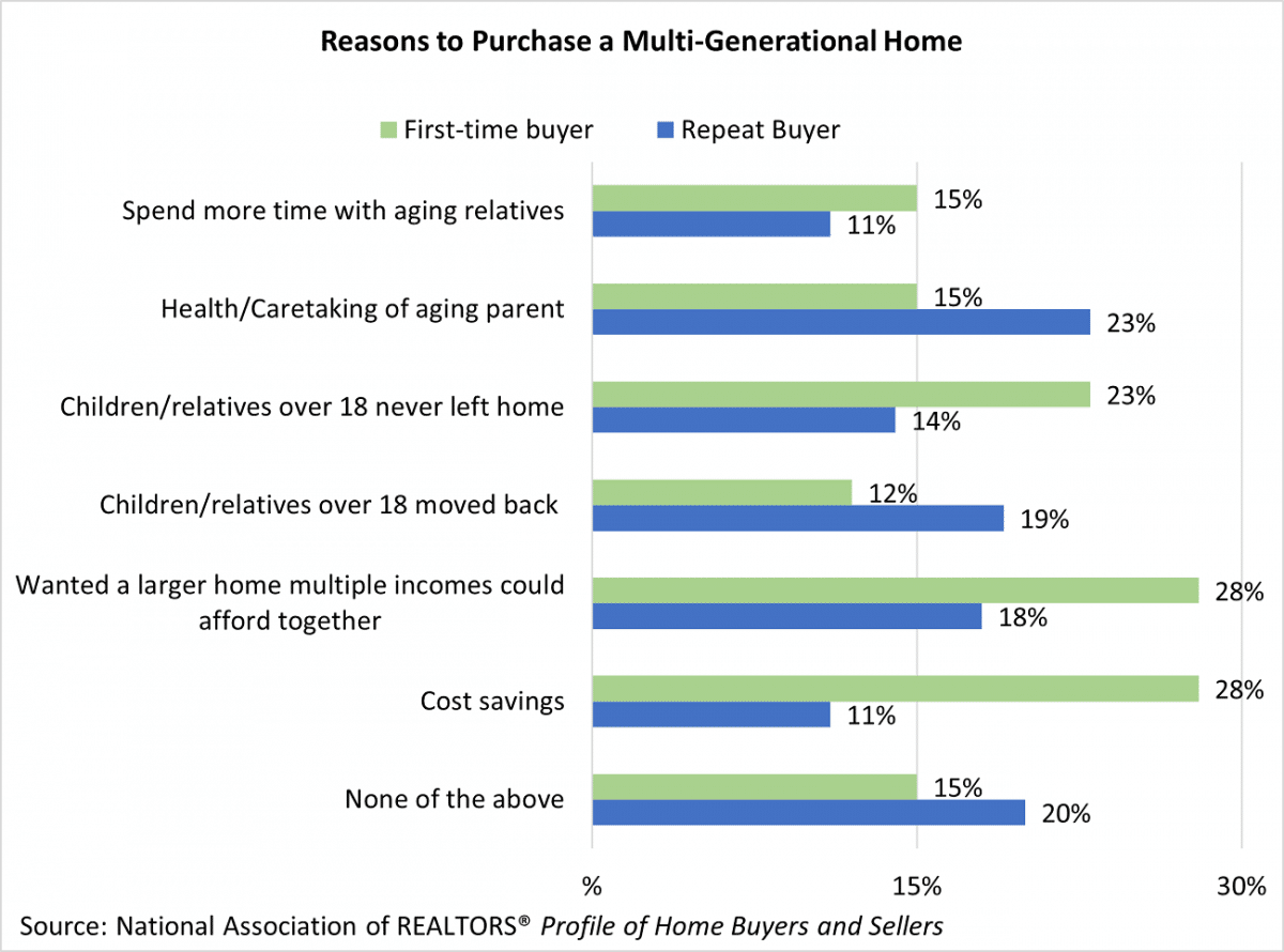 While reasons for purchasing properties with family members vary case by case, NAR’s report found that a majority of first-time buyers who purchased a multigenerational home did so because of cost savings or for the purpose of affording a larger home thanks to the multiple incomes that would be contributing to mortgage payments. Repeat buyers, on the other hand, were more likely to engage in multigenerational buying for health reasons or to take care of an aging relative.