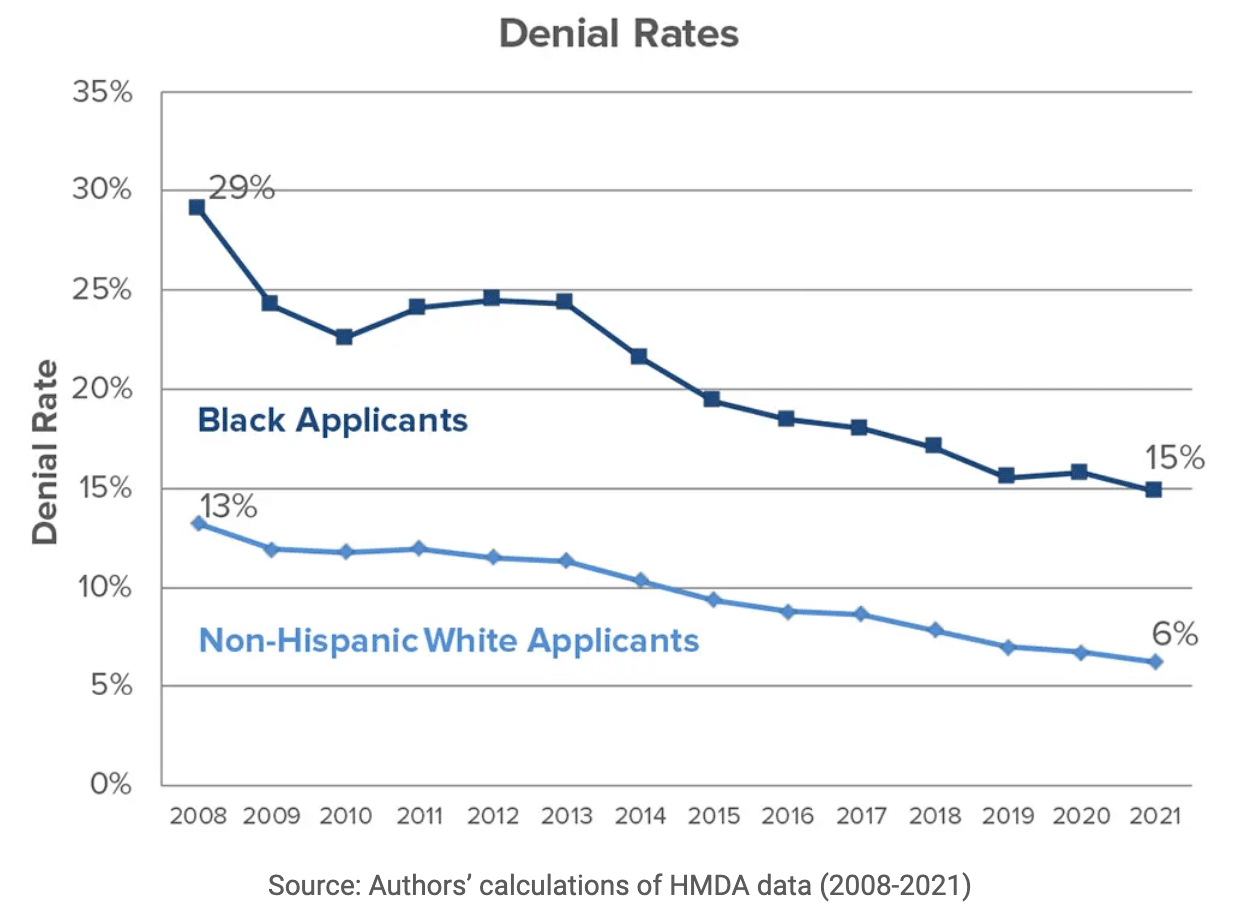 As a result, the number of loan applications from Black people rose by 13%, year over year, in 2021, while the number of originations rose by 15%. However, Black applicants continued to experience higher loan denial rates than white applicants. In 2008, 29% of Black applicants were rejected by independent mortgage companies, compared to 13% of white applicants. And though denials went down overall, in 2021, the racial gap continued. The percentage of Black applicants denied by independent mortgage companies that year was 15%, nearly triple the 6% denial rate of white applicants.