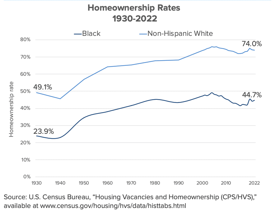 Just 45.3% of Black households owned their own homes in 2022, according to the National Association of Real Estate Brokers (NAREB), compared to 74.6% of white households. That 29-point percentage gap is larger than the 27-point gap in 1960, before the Fair Housing Act was passed.