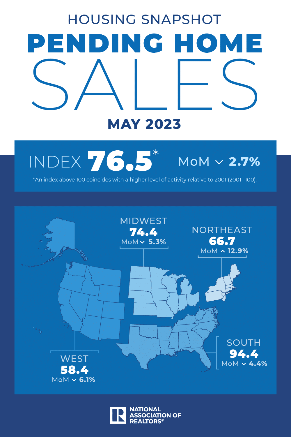 May pending-home sales slid 2.7% compared to April and fell 22.2% from a year earlier as low inventory continued to keep transactions at a slow tempo, the National Association of REALTORS® reported, citing its Pending Home Sales Index.