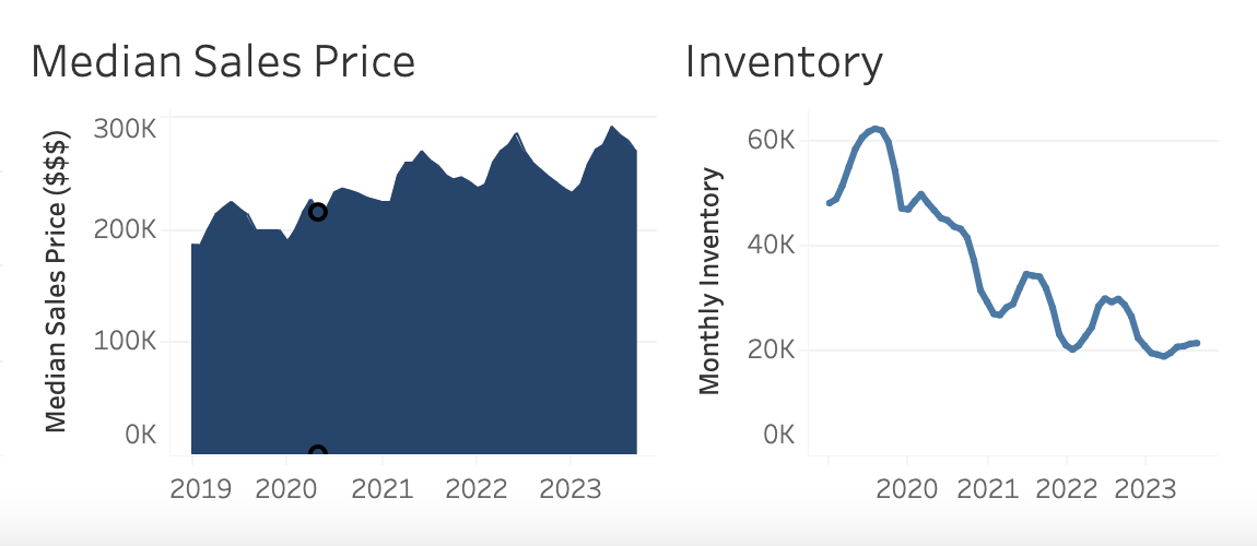 Within the city proper, 1,830 homes sold, an 11.3% decrease, while the median price inched up 1.4% to $324,450.
