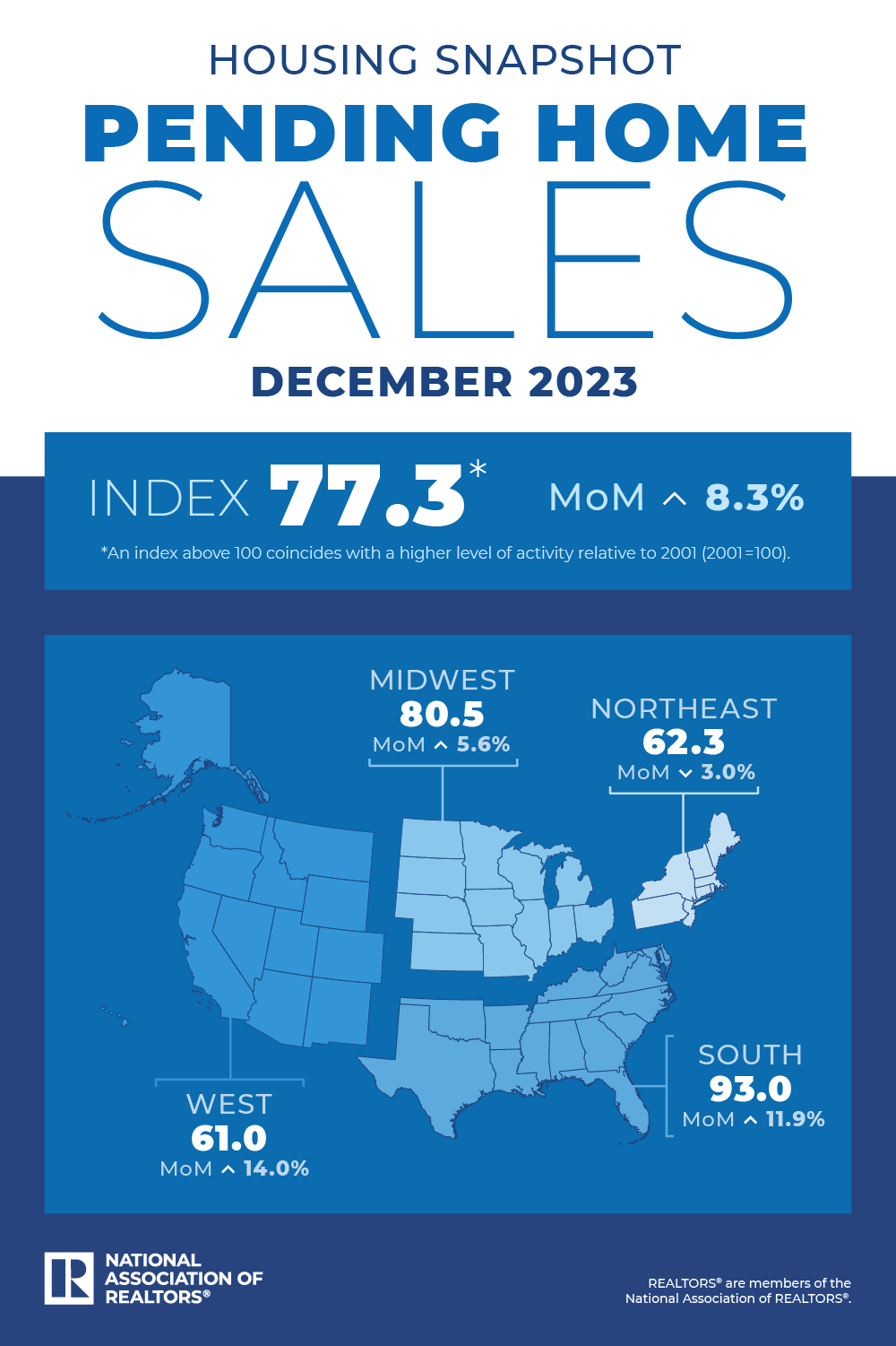 Pending home sales jumped 8.3% from November to December as mortgage rates continued to decline, the National Association of REALTORS® said, citing its Pending Home Sales Index.