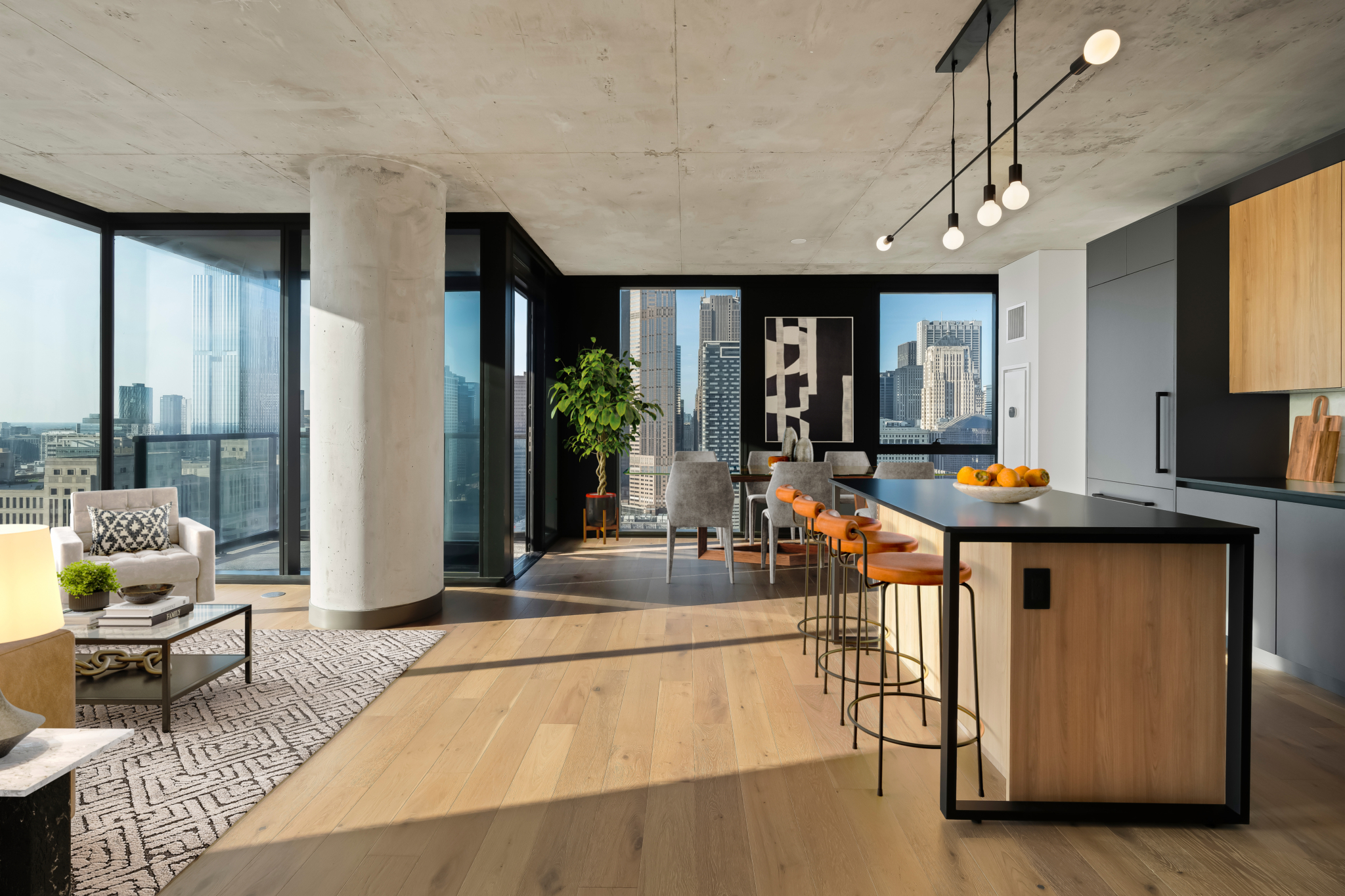 Kitchens boast paneled appliances, sleek modern cabinetry and wide plank hardwood flooring — many have expansive islands with quartz countertops. All units have concrete ceilings and kitchens that open to a great room with breathtaking water views out dramatic floor-to-ceiling windows.