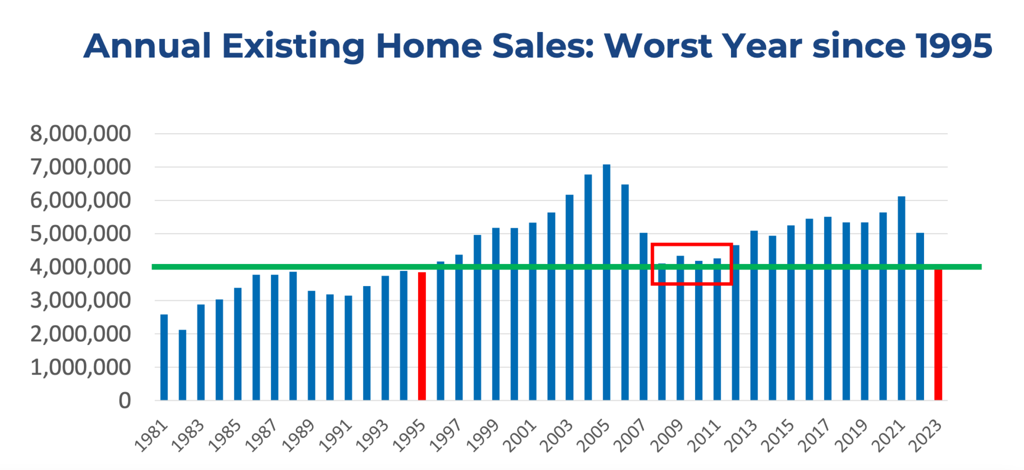 In 2023, when existing-home sales reached record-low levels, they closely mirrored the recession years of 2008, 2009, 2010 and 2011. “But the big difference is that during the Great Recession, people were losing jobs, people did not have income… they could not buy homes. But today, we are creating jobs, yet we are not getting home sales due to the lack of inventory.”