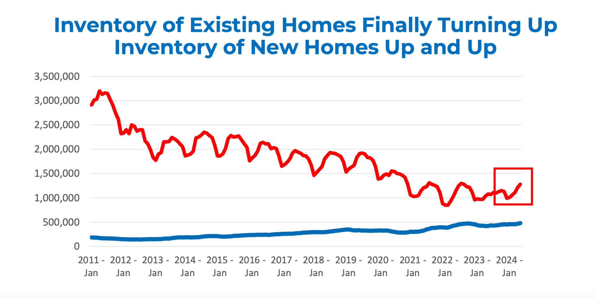 Red is existing-home inventory; Blue is new-home inventory, via NAR