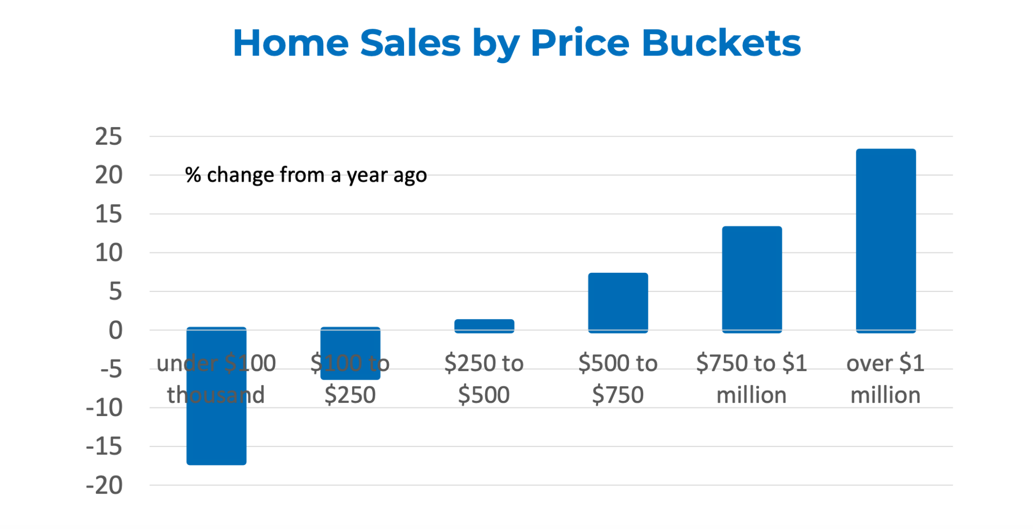 With supply rising, home prices are beginning to peter off. “If you have a listing, don’t expect prices to be 10% above one year ago,” he said. Some markets may even require a price reduction. By price bucket, there is more inventory at the upper end of the market, and, in turn, more expensive home sales are improving.