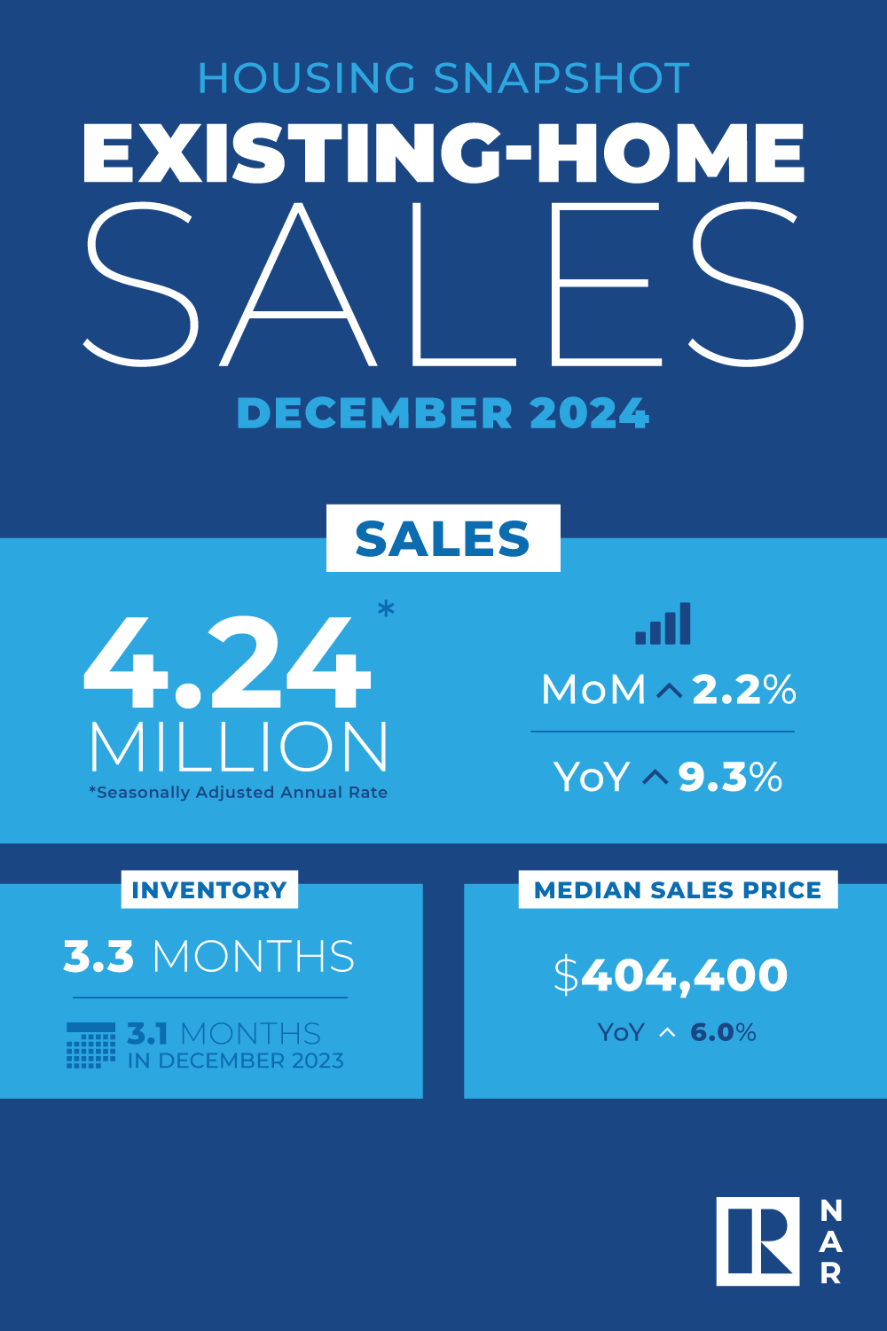 Specifically, sales rose 2.2% from November to a seasonally adjusted annual rate of 4.24 million. Year over year, sales were up 9.3% from 3.88 million in December 2023.