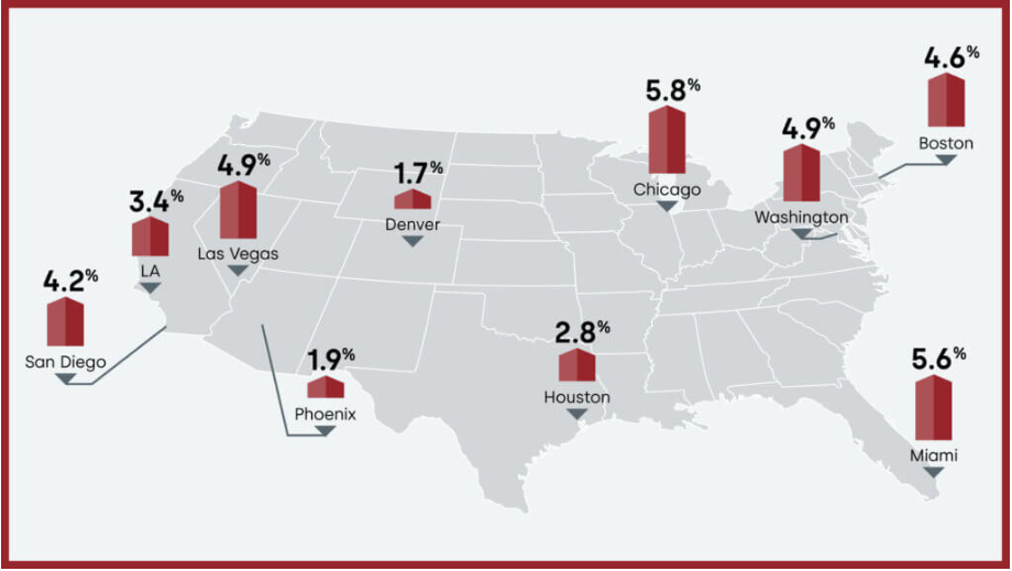 On a city basis, Chicago posted the highest annual increase among the country’s 20 largest metro areas with a 5.8% gain, followed by Miami with a 5.6% rise and Las Vegas and Washington, D.C., which both saw 4.9% increases.