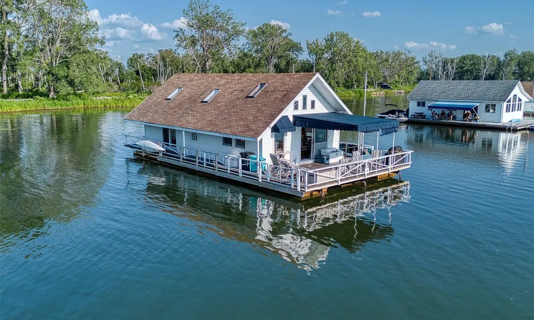 This Erie, Pennsylvania property is both — it’s a three-bedroom, two-bathroom home floating in the middle of Horseshoe Pond, Lake Erie. Transportation not included.