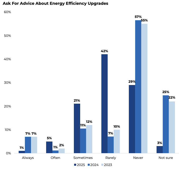 Twenty-seven percent of real estate agents surveyed by the National Association of REALTORS® in April said clients ask them about energy-efficiency upgrades, up from 19% in 2024, while 29% said clients never ask about them, and 42% said they rarely ask about them, compared to 57% and 7%, respectfully, according to NAR’s annual Residential Sustainability Report.