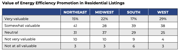 Regionally, energy-efficiency promotion in residential listings is considered very valuable by 22% of the NAR survey’s respondents from the Midwest and somewhat valuable by 28%. Westerners appear to value it the most, with 29% saying it’s very valuable and 38% saying it’s somewhat valuable. In the South, 17% of Realtors called it very valuable and 39% said it’s somewhat valuable, while those numbers were 15% and 41%, respectively, in the Northeast.
