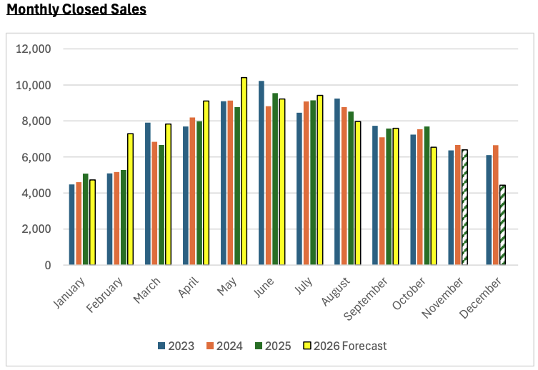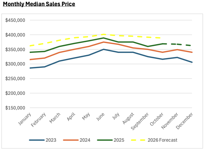 The outlook for Chicagoland in 2026 is generally stronger than that for the nation as a whole. DePaul’s Institute for Housing Studies expects closed sales to rise 5.1% to 80,116 through the year ending in October 2026. The median sales price is forecast to rise almost 5% over that time, from $369,051 to $386,972.