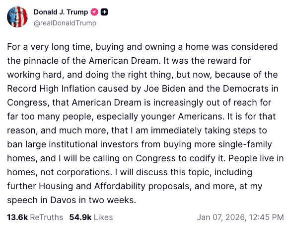 “Their holdings are concentrated mostly in the South and Sunbelt, where inventory is relatively high and home prices have actually fallen, undermining claims that these investors drive housing costs higher. With most investor-owned homes held by small, local landlords, the proposed restriction is unlikely to meaningfully improve affordability or housing supply.”