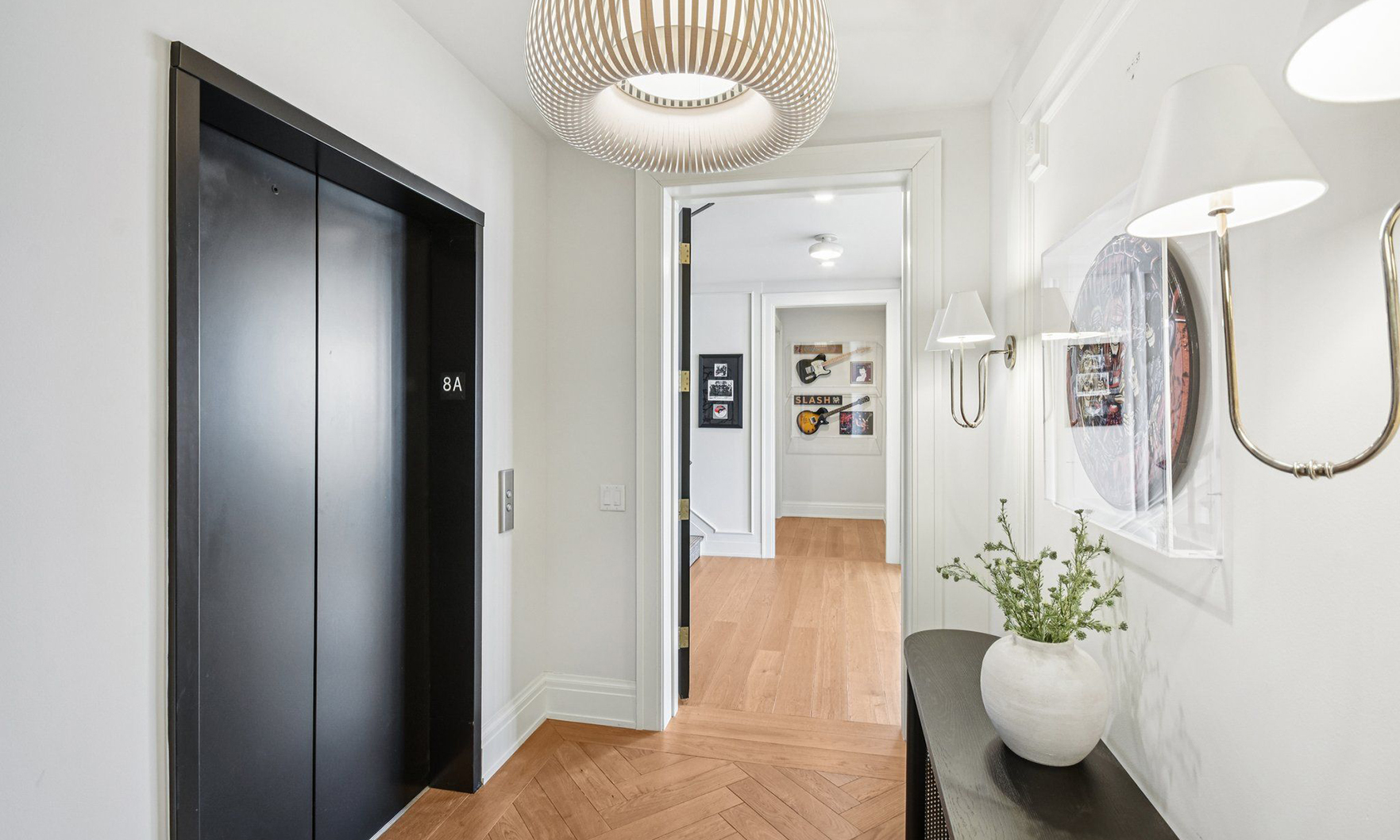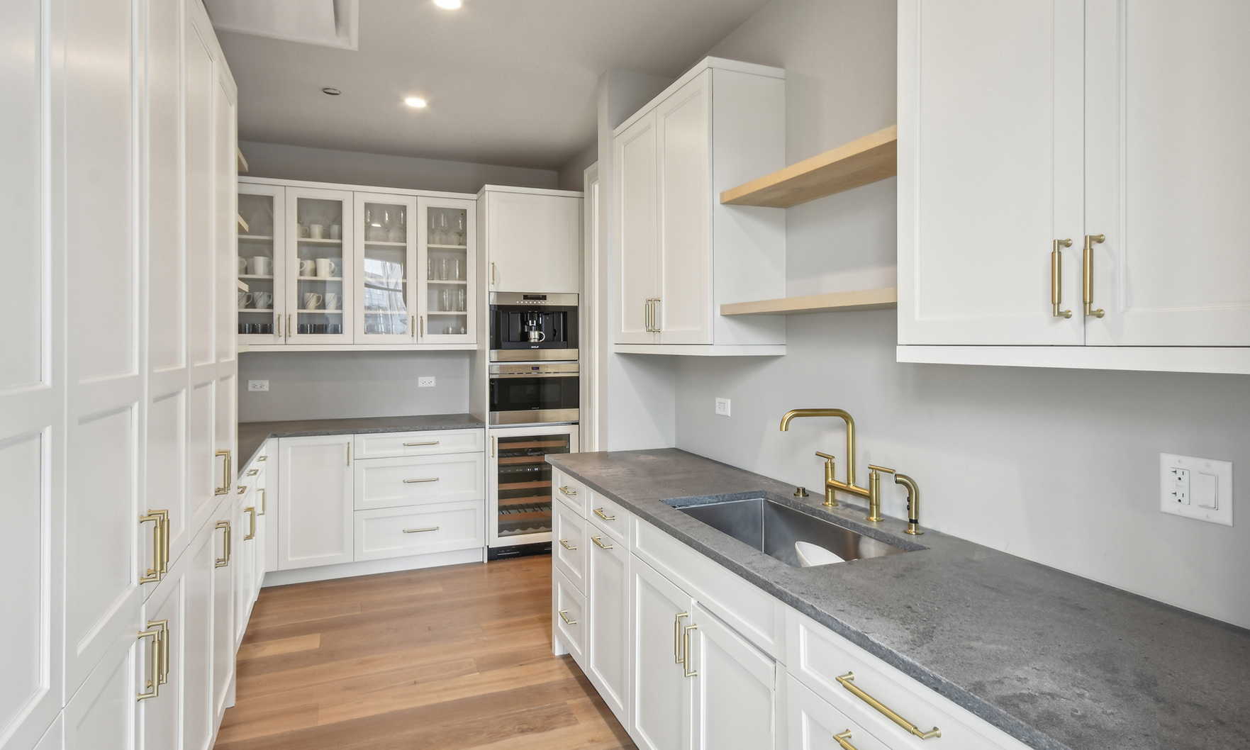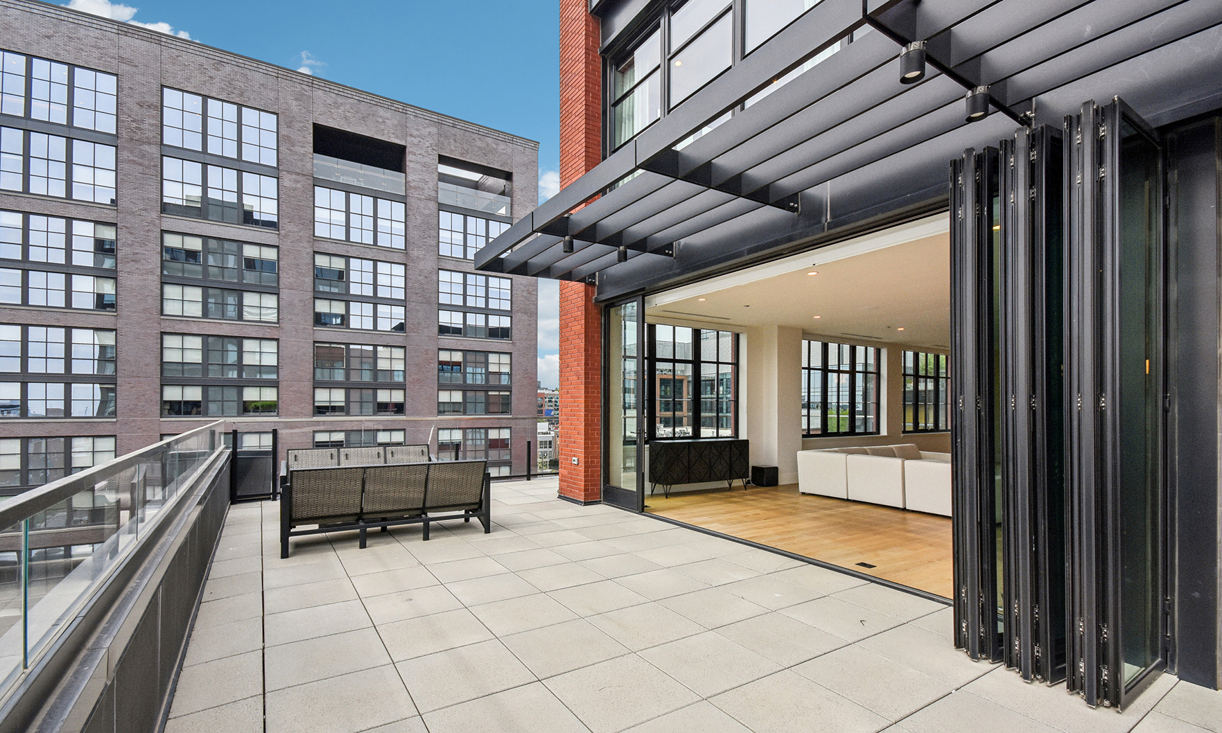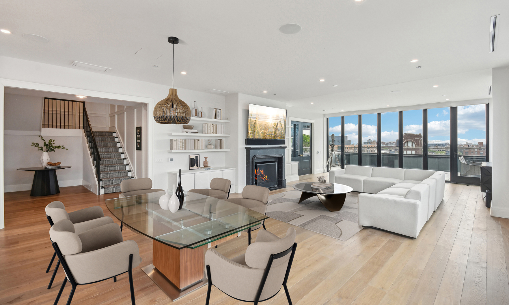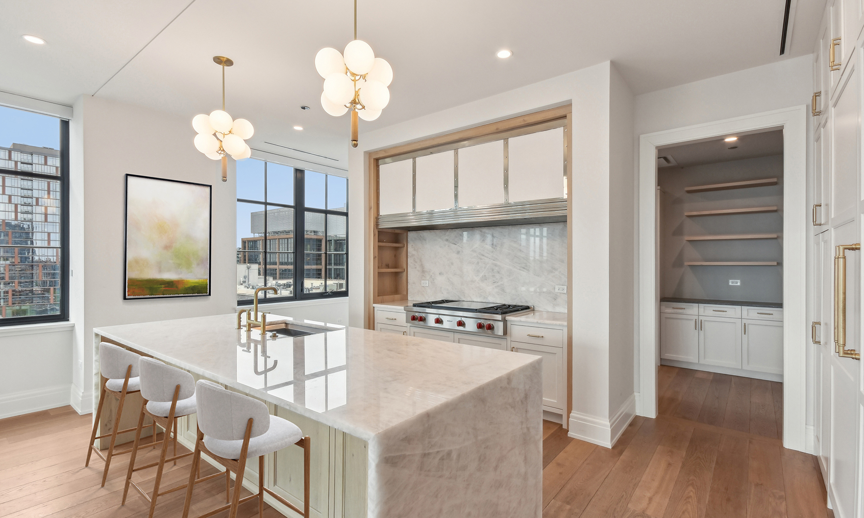 Spanning two expansive levels, this four-bedroom, 4.5-bathroom home boasts soaring 10-foot ceilings and a show-stopping 850 square-foot wraparound terrace with panoramic skyline views, a fully equipped outdoor kitchen and 20-foot retractable NanaWall glass doors — perfect for seamless indoor-outdoor entertaining. The gourmet kitchen features elegant quartzite countertops, Sub-Zero and Wolf appliances and a large walk-through pantry, complete with a wine fridge, built-in coffee station, secondary dishwasher, sink and generous storage. The open-concept living area centers around a custom-honed marble fireplace and tailored built-ins.