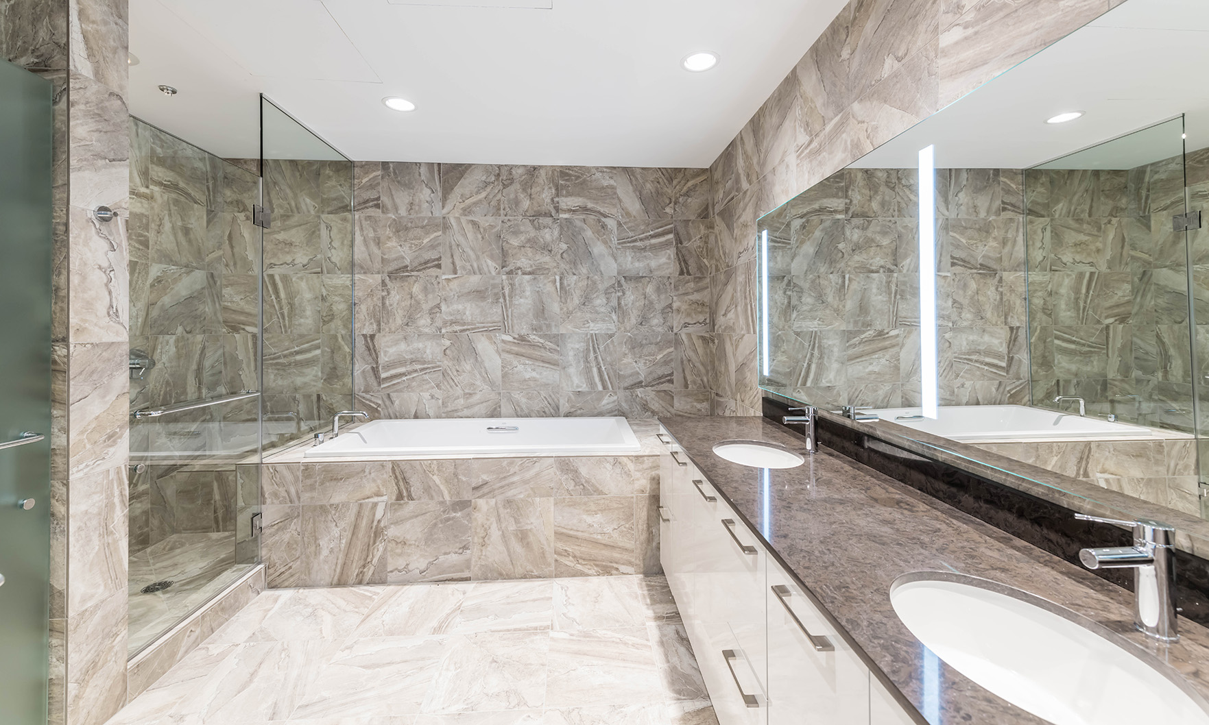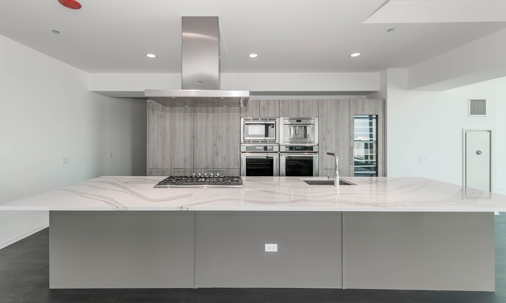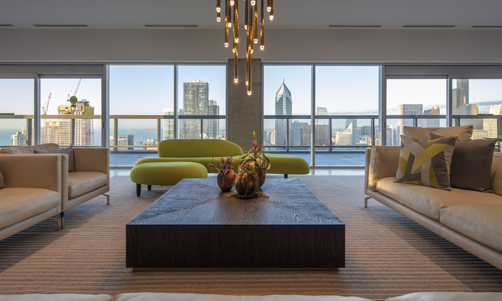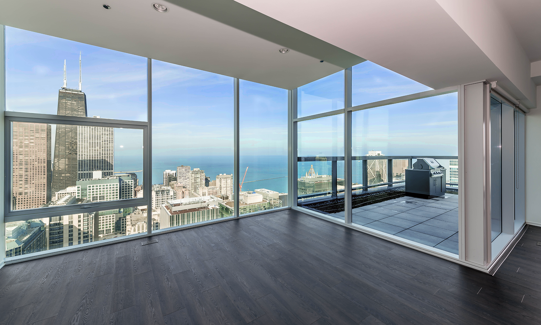 Every detail has been carefully considered to maximize both function and luxury while maintaining uninterrupted views of the surrounding cityscape. Ten-foot ceilings and wrap-around floor-to-ceiling glass windows with integrated roller shades frame sweeping vistas of Lake Michigan, the Chicago River and the surrounding skyline. The home’s upgraded chef’s kitchen anchors the open floor plan and is appointed with Viking and Thermador appliances, including double ovens with warming drawers, Snaidero cabinetry and a 98-bottle wine refrigerator. A large corner terrace extends the living space outdoors and features a fire pit and a Napoleon grill. The penthouse’s primary suite provides a private retreat with a thoughtfully designed spa-like en suite bathroom and ample storage, including solid shelving and integrated shoe racks.