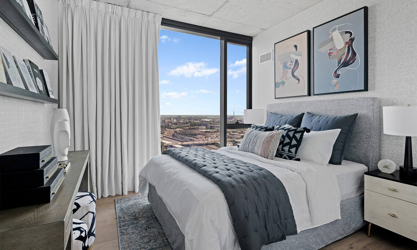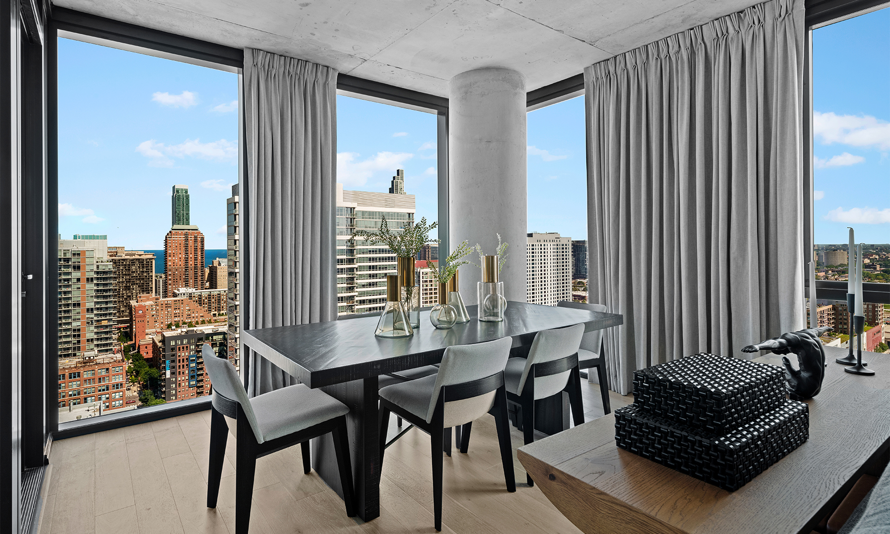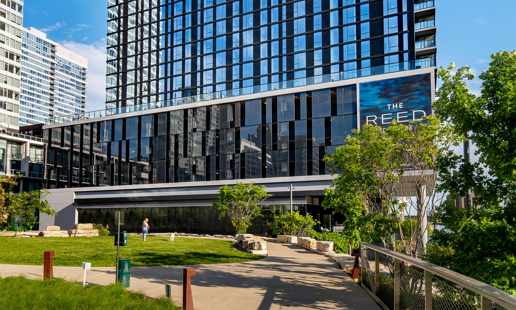 Now open, The Reed is a brand-new, 41-story luxury tower perfectly placed along the South Branch of the Chicago River. The area’s industrial past has influenced a chic modern design with resort style amenities. This bright and sunny home offers river and city views from full height windows and terrace. Finishes include concrete ceilings, wood floors, black metal, quartz counters and more.