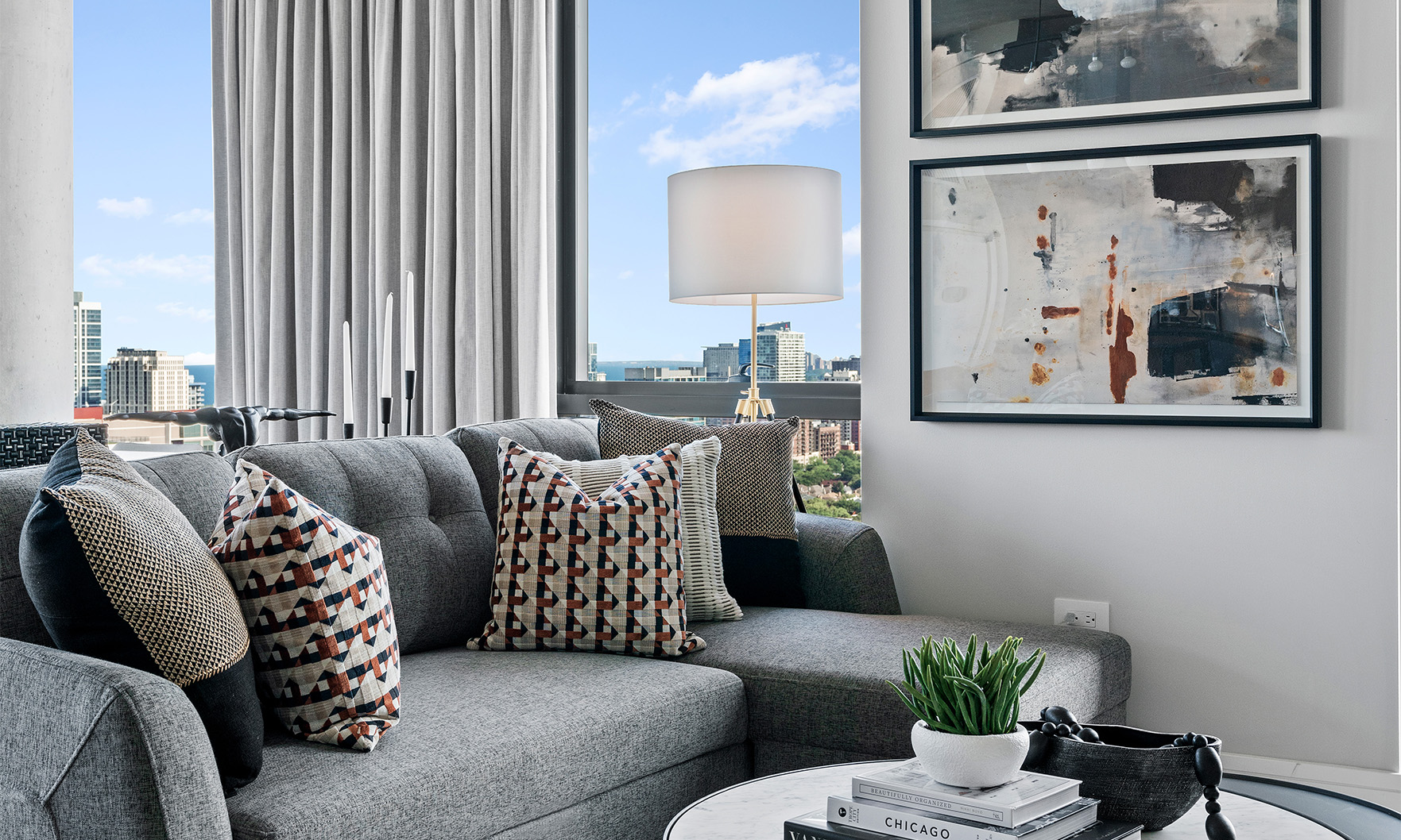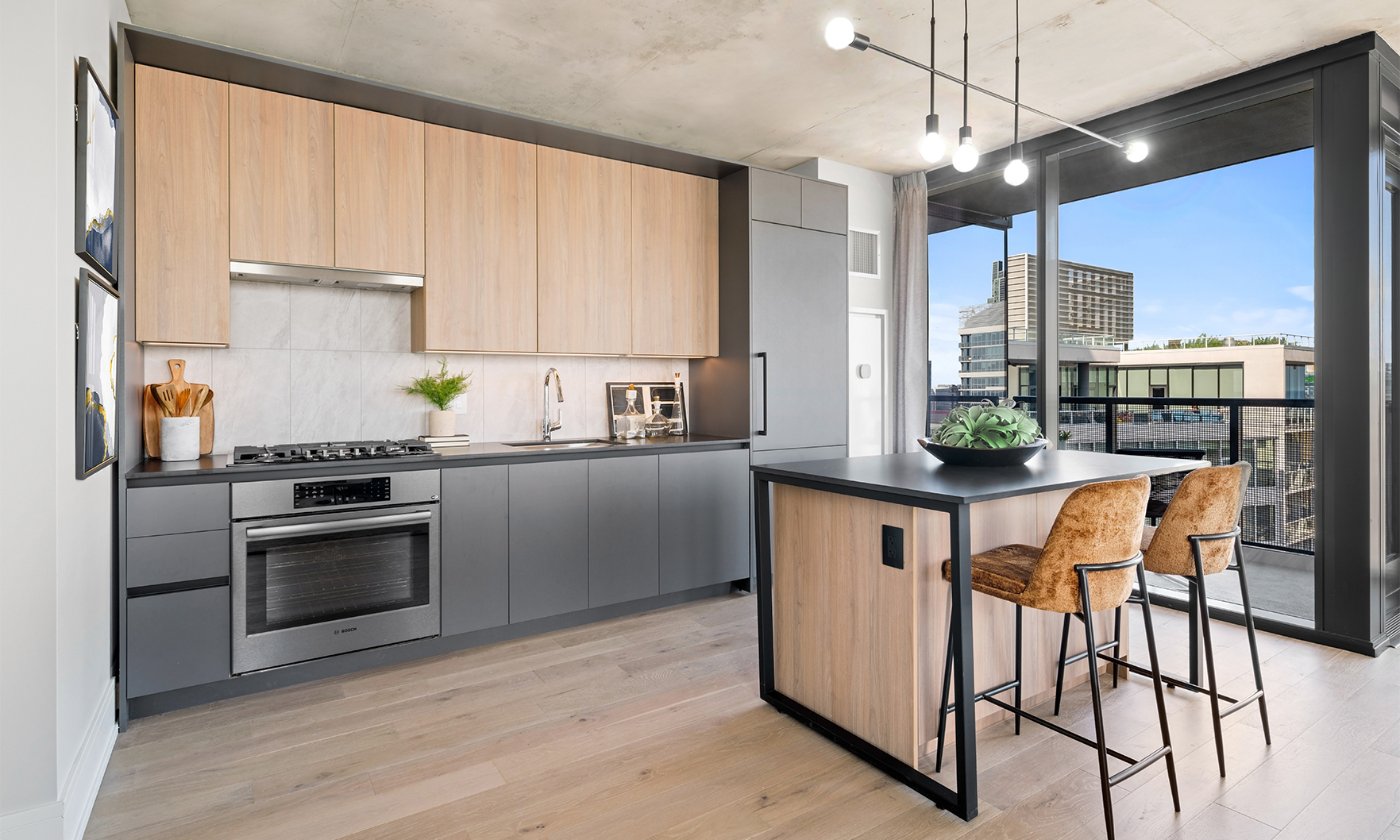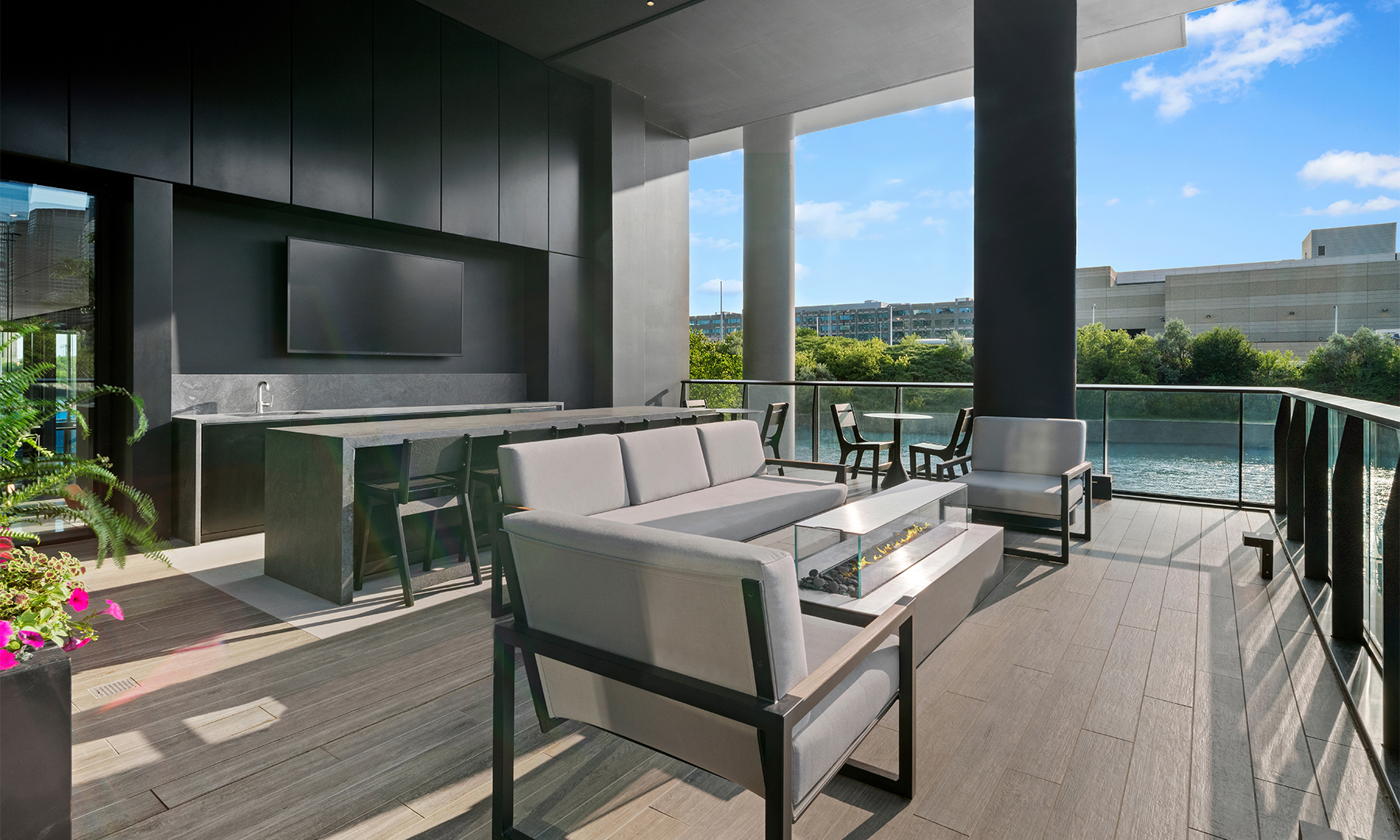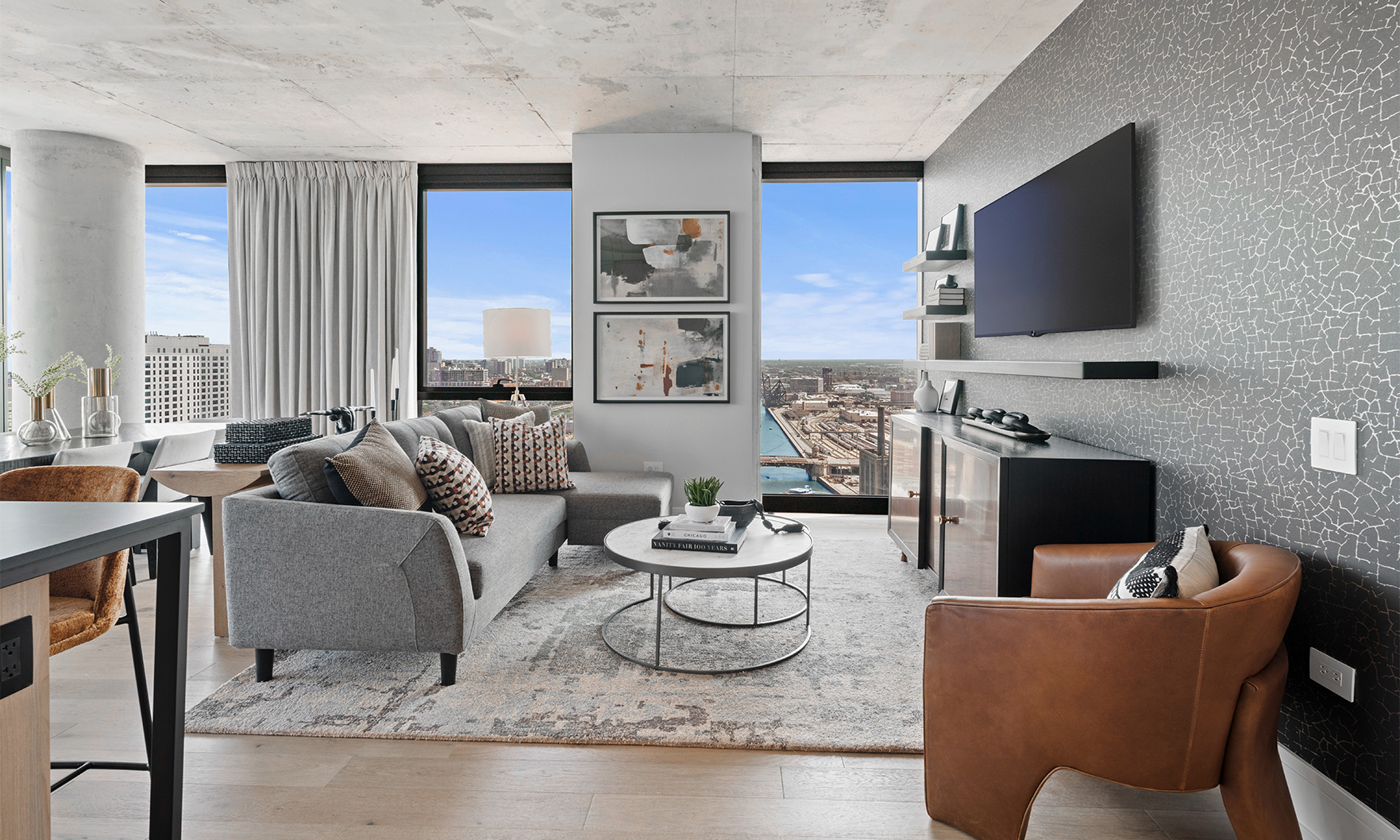 Now open, The Reed is a brand-new, 41-story luxury tower perfectly placed along the South Branch of the Chicago River. The area’s industrial past has influenced a chic modern design with resort style amenities. This bright and sunny home offers river and city views from full height windows and terrace. Finishes include concrete ceilings, wood floors, black metal, quartz counters and more.