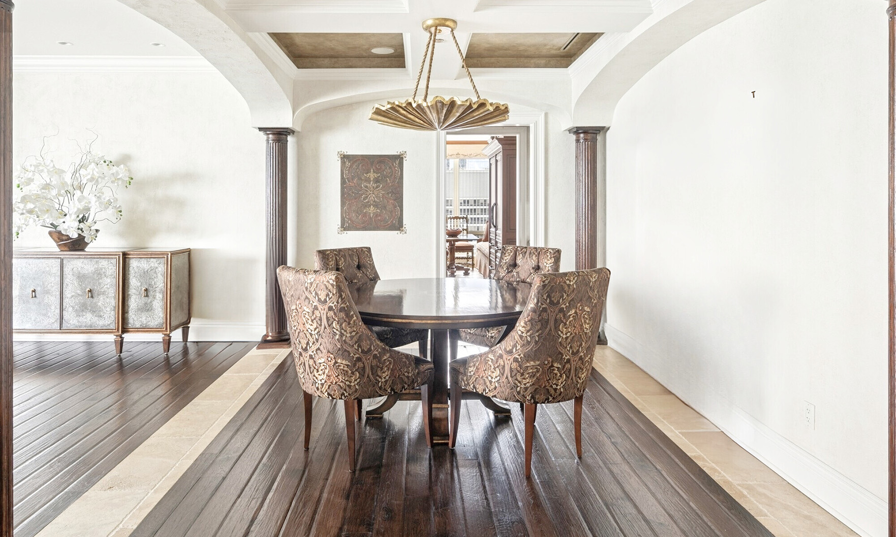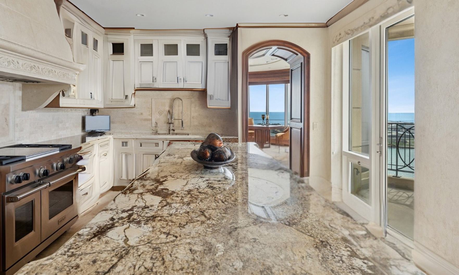 The chef’s kitchen is fully outfitted with top-of-the-line appliances, including dual Sub-Zero refrigerators, a 48” Wolf range, Miele dishwasher, built-in Kuppersbusch espresso machine and granite countertops. A sunny south-facing balcony offers the perfect spot for grilling or morning coffee.