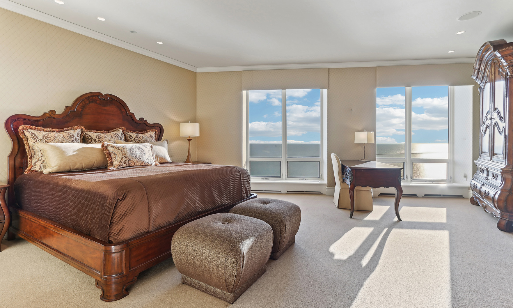 Spanning over 3,000 square feet, this three-bedroom, 3.1-bath residence lives like a single-level home in the sky. The custom layout was thoughtfully reimagined to maximize flow, function and privacy — offering expansive entertaining spaces and serene private quarters, all framed by floor-to-ceiling windows with sweeping views of Lake Michigan and the skyline.